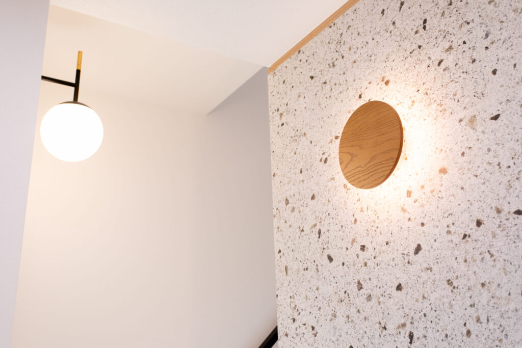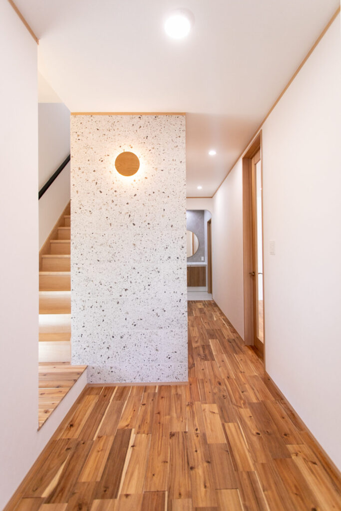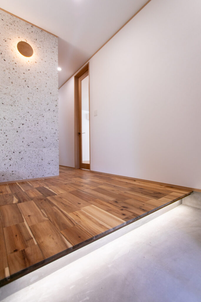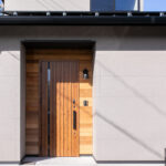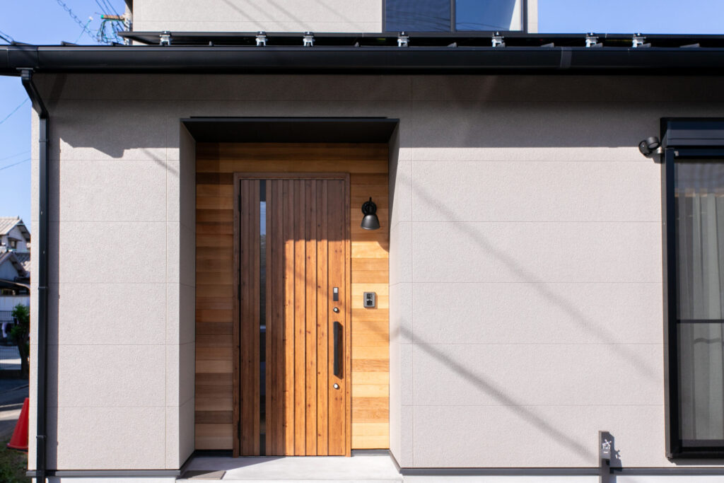 ✓グレーの塗り壁風サイディングに無垢のアクセント